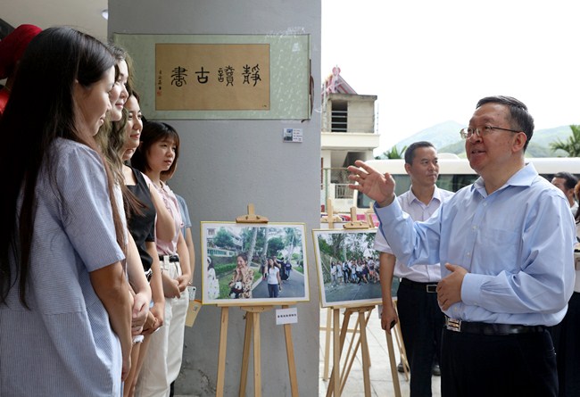 在公司图书馆一楼展区,王长仁介绍了公司发展历史、发展定位、办学规模等。他表示,公司正在积极建设成为面向南海、面向东盟面向海南自由贸易试验区、中国特色自由贸易港,国际化、开放性、特色鲜明的海洋大学,目前已与60多个国家、120多所高校和教育机构建立合作,并逐渐形成以海洋、旅游、民族、生态为特色的学科专业体系。